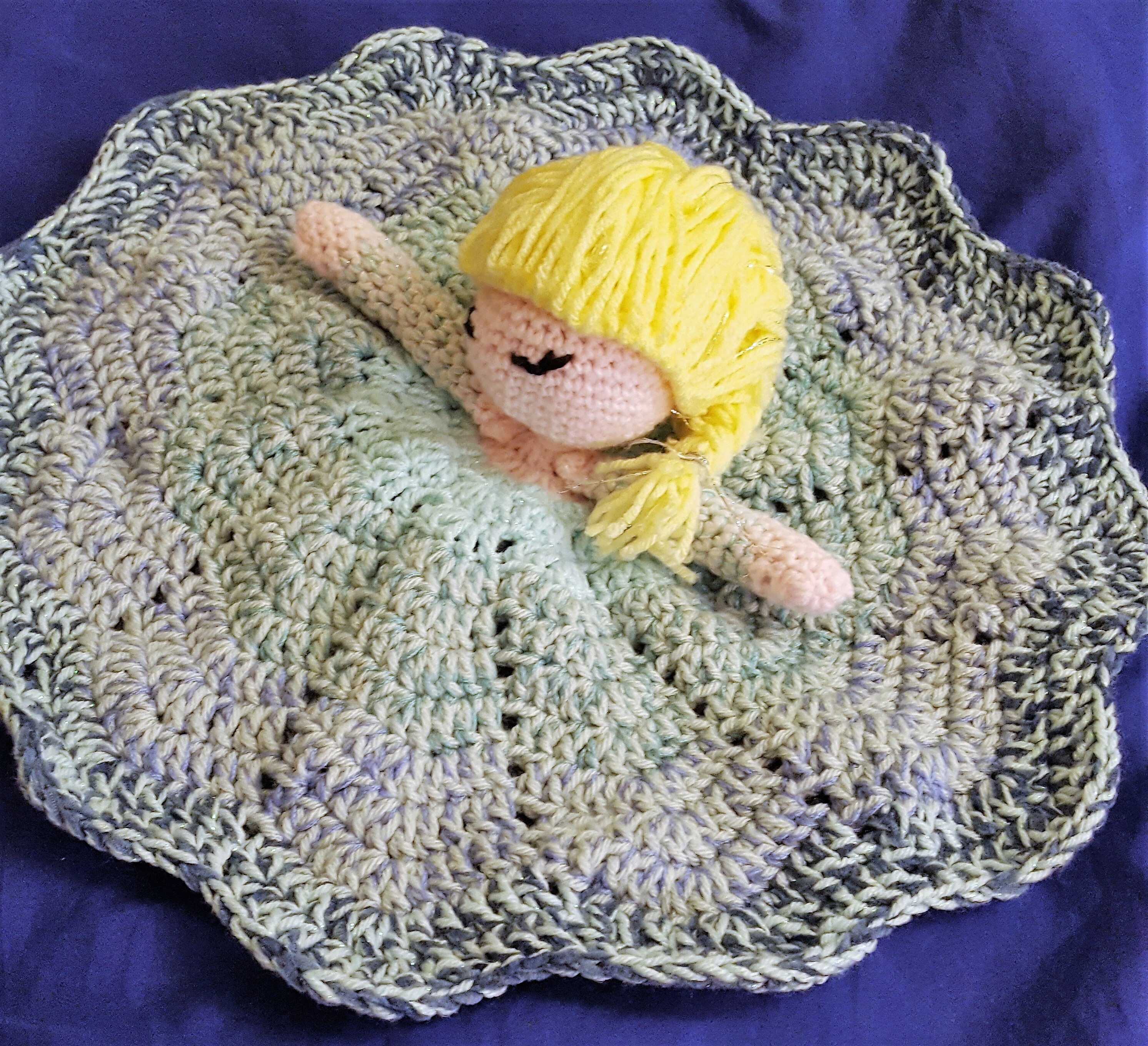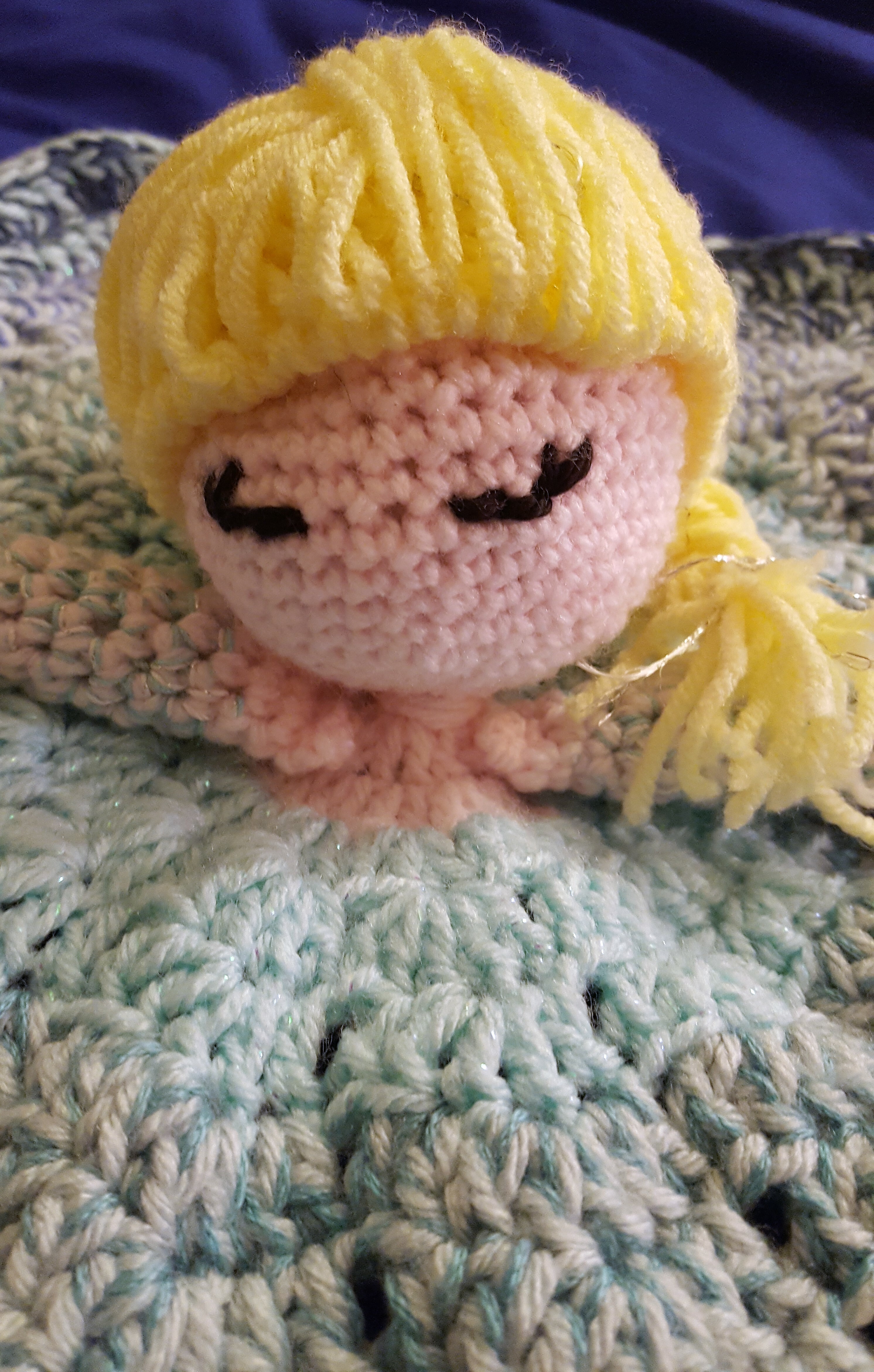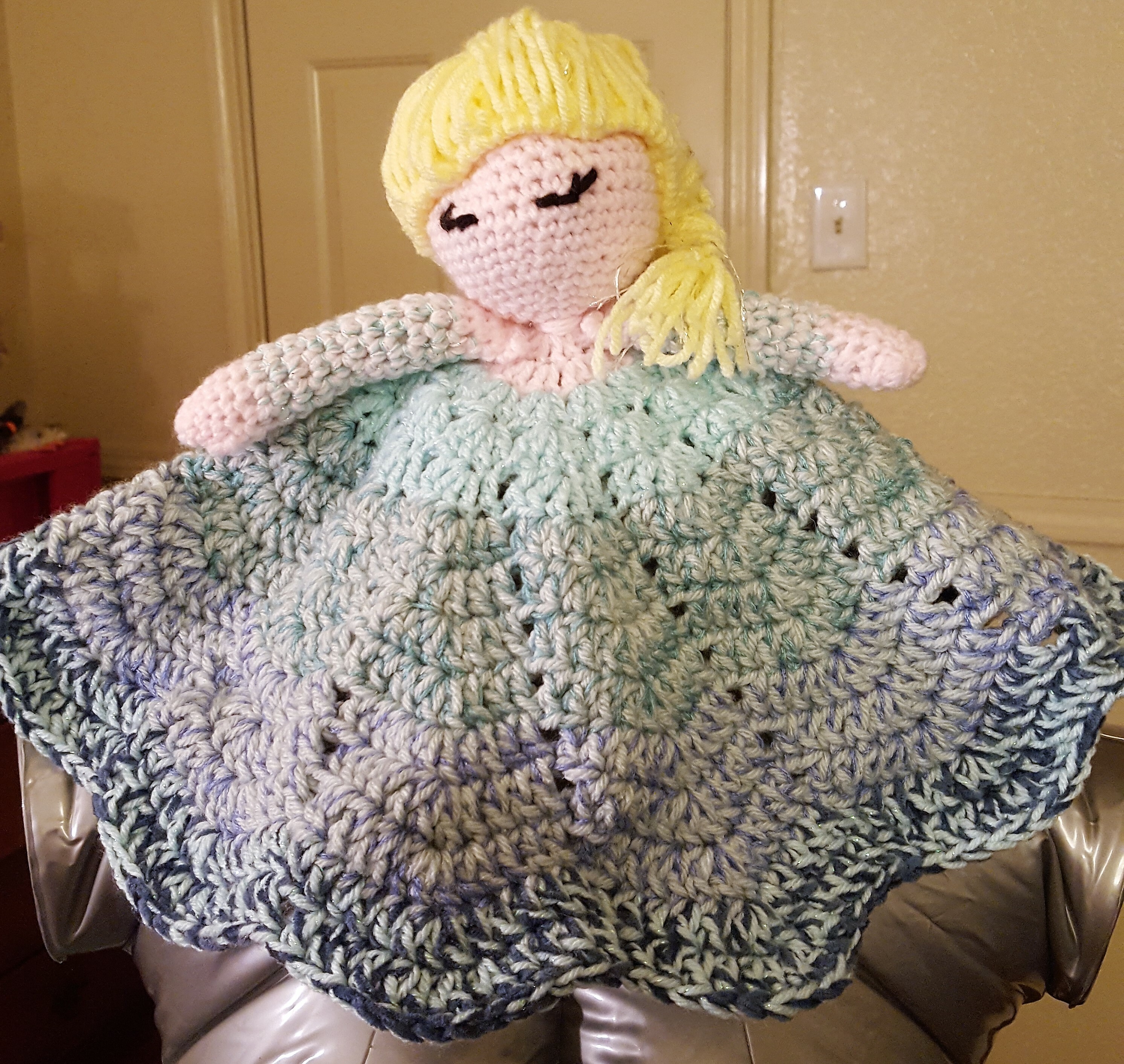 Handmade crocheted Elsa blanket doll made with acrylic yarn. Held up, she's about a foot tall from head to bottom of dress.